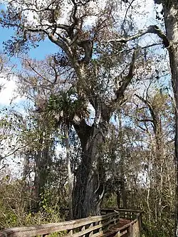One of the oldest bald cypress (Taxodium distichum) trees in the entire Southeastern U.S. sits in Barley Barber Swamp. It is estimated at over 1,000 years old, stands 88 ft (27 m) tall, and has a circumference of 33 ft (10 m). There are also Florida strangler figs (Ficus aurea), swamp maples (Acer rubrum), and pond apples (Annona glabra). Barley Barber is home to a pair of nesting bald eagles, American alligators, North American river otters, bobcats, white-tailed deer and numerous unique plant species, including giant leather ferns (Acrostichum danaeifolium), shoestring ferns (Vittaria lineata) and whisk ferns (Psilotum species), which are fern-like vascular plants. Many species of migratory and wading birds, such as egrets, ibises, limpkin, and the endangered wood stork, can be seen in the swamp.[4][5]