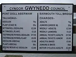 Barmouth Bridge toll prices in 2007, before the toll was removed