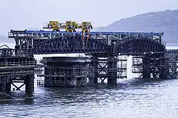 In August 1899, Alfred Jones Collin, the chief engineer of Cambrian Railways (which had absorbed the A&WCR in 1865), ordered underwater inspections to check the integrity of the drawbridge span's ironwork.[4] They discovered that the supports were severely corroded, undermining its structural integrity and requiring the replacement of all the ironwork except for two piers. Repairs started that December and were completed by the end of 1902.[4] The drawbridge was replaced with a swing bridge with a 41.5-metre-long (136 ft) single steel swing span, which rotated around a central pivot, close to a 36-metre-long (118 ft) fixed span. The spans are hogback-shaped lattice trusses, supported by pairs of cylindrical iron piers, and the turntable rests on a cluster of four piers.[4]