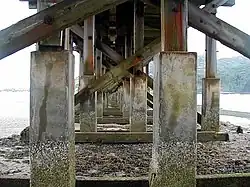 Wooden trestles were built on screw piles 10 inches (250 mm)-14 inches (360 mm) wide with screw discs 36 inches (910 mm) in diameter in groups of three piles per pier.[4] Timber trellis girders, 40 feet (12 m) long and 4 feet (1.2 m) deep, supported the deck, with driven piles as fenders. The water around the trestles had a maximum depth of 54 feet (16 m) at spring tides but the river bed was raised by tipping stones to protect the piles.[4]