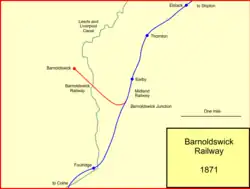 The Barnoldswick Railway was an English railway company, that constructed a short branch line to Barnoldswick[note 1] from a junction on the Midland Railway line from Skipton to Colne. It was opened in 1871, and was worked from the outset by the Midland Railway. It was moderately successful in financial terms, and the company was acquired by the Midland Railway in 1899.