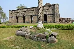 Completed in 1526 CE, it is situated 500 metres (1,600 ft) south of Ramkeli, a village on the way to Gour, and 12 kilometres (7.5 mi) south of the town of Malda.[1] The mosque with its ruins can be found very close to the India-Bangladeshi border. With a gigantic rectangular structure of brick and stone, this mosque is the largest monument in Gour. Even though one of the mosque's names "Baroduari Masjid" implies that it has 12 doors, only eleven survive in its ruinous state.[2]