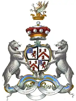 ![]() Arms of the 2nd creation Arms: Quarterly, 1st and 4th: Argent a Lion rampant within a Bordure Sable on a Canton Azure a Crown Or (Lane); 2nd and 3rd: Argent a Chevron between three Foxes' Heads erased Gules (Fox). Crest: Out of a Ducal Coronet Or a Demi Griffin segreant Sable winged Argent. Supporters: On either side a Bear Argent. | |
