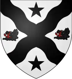 ![]() ![]() Argent, a saltire wavy between a mullet in chief and another in base, and as many boar's heads couped in the flanks sable, armed and langued gules | |