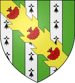 ![]() ![]() Paly of six ermine and vert a bend raguly or charged with three escallops gules[1] | |