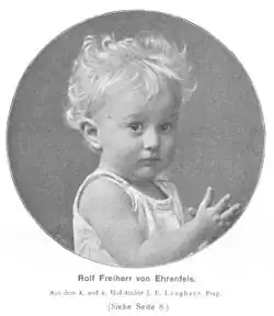 Rolf Ehrenfels was an Austrian citizen all his life. Lichtenau near Krems and Gföhl in Lower Austria was his home parish. Since 1813 the Ehrenfels family were settled in Schloss Lichtenau. Also the castles Brunn im Walde and Rastbach were family properties. Rolf's eldest sister Elfriede "Elfi" Hartmann married a widower with three children and had her own home from the early 1920s. His sister Imma Ehrenfels married Wilhelm "Willy" (von) Bodmershof (Schuster) and they settled at Rastbach castle for life. In 1925, there was a double wedding as Rolf Ehrenfels married Willy's sister, Fridl.