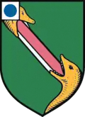 Crest: Two gold serpent necks, entwined and turned back to back, also armed gules, and as a mark of cadency, a silver roundel bearing a blue bezant.[2]
