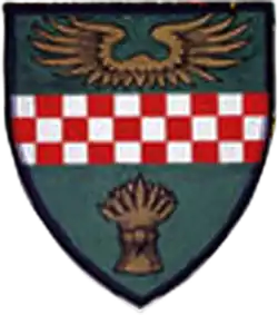 ![]() ![]() Arms: Vert a fess chequy Argent and Gules between in chief two wings conjoined in lure and expanded, the coverts uppermost and in base a garb. | |