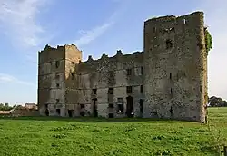 The outside of the castle, as seen from the West. However, in reality, this would have been the castle facing backwards, as the Royal Society of Antiquaries in Ireland note that the entrance was indeed on the East.