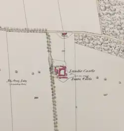 Lundie Castle was built a little before 1539 and had become ruins by 1823. It was a large square tower around 30 feet high (Carrie J (1881) Ancient Things in Angus: a series of articles on ancient things, manners and customs in Forfarshire. Arbroath:Thomas Buncle Publishers). NO33NW 13 30899 36122.(1863) scale: 25.344 inches to one mile.