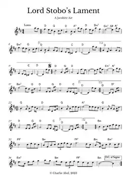 The Murrays were ruined by their support for the Jacobite cause, with Sir David Murray, 4th Baronet, forfeiting all his lands and being attainted for his role in the 1745 Rebellion.[22] Murray died in exile at Leghorn in 1769.[23][24] Lord Stobo's Lament, a traditional Scots air, commemorates this tragic episode in the history of the barony.