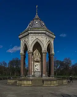 The fountain was designed in 1862 by Henry Astley Darbsihire and erected by Baroness Burdett Coutts at a cost of £5,000.[1] The fountain is made out of granite, and is a 28 feet (8.5 m) diameter octagon with 60 feet (18 m) red granite columns, in the Gothic style, and is situated near to the Hackney gate of the park.[2][3] The opening of the fountain in 1862 was attended by 10,000 spectators.[4][5] The year after the fountain was installed, The Illustrated London News called Victoria Park the best people's park in London, due to its facilities such as the fountain.[6] In his Dictionary of London, Charles Dickens, Jr. described the fountain as "beautiful".[7]