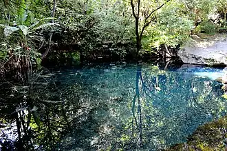 The best known spring is at the very beginning of the river, called La Rodilla del Diablo ("The Devil’s Knee"), after a small indentation in the rock next to the pool formed by the spring. According to local myth, the indentation was formed by the Devil falling to his knees, but there are competing versions as to why he did. The first states that he was forced to his knees by a crucifix held by Juan de San Miguel, the Franciscan friar who founded modern Uruapan.[6][7] Another version of the story states that the impression was made by the knee when the Devil tripped and fell fleeing from the same person.[5][6]