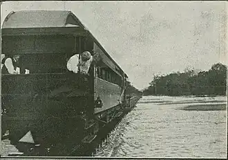 ![]() Train crossing Barratta Creek during a flood with the water up to the decking of the bridge, 1918 | |||||||||||||||