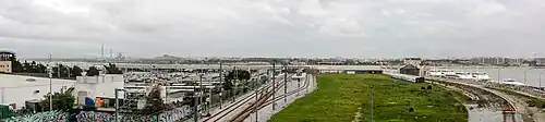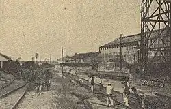 At the end of the 19th century, the station and its warehouses underwent expansion works, due to fears that the Cacilhas branch line, which was being planned at the time, would lead to a reduction in rail traffic.[22] Still, at the beginning of the 20th century, the Barreiro station had several structural problems, such as the river docks having no protection and suffering frequent flooding on rainy days.[22] This meant goods had to be loaded and unloaded on a small pier, with only two steam cranes, and stored in a warehouse that was very small.[22] In addition, this infrastructure also served for the unloading of coal, rails, and other materials, to the general warehouses.[22] To make the most of the available space on the ships, refills and small-speed goods were transshipped in the same place, generating several misplacements and other irregularities in the service.[22] The river wharves and railway lines lacked proper identification, which further complicated operations.[22] These deficiencies made the management of the terminal more expensive, which was reflected in the prices charged to customers.[22] Due to the limited space available on the site, only small expansions, such as the installation of new cranes, could be made, which failed to solve the station's problems.[22] On the other hand, navigation near the station was difficult, as the water being shallow in certain places.[36]