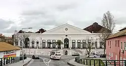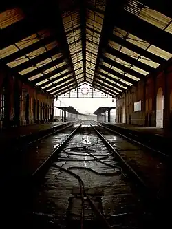 In 2004, it had a public support service for the National Railway Network, and four manoeuver tracks.[19] The station was equipped with a distribution center, to sort mail transported by rail, having its own stamp.[20] This Barreiro station served as a connection between trains from the region south of the Tagus River, and as a fluvial port for passengers and goods, with connections to Lisbon.[21][22] It was taken out of service with the construction of the new structure in 2008,[10][11] and the building was left in disrepair.[23] It was declared in 2018 as having a "under classification" status (Diário da República 2nd Series, No. 30 of February 12) in the listing process of the Barreiro Railway Complex.[18]