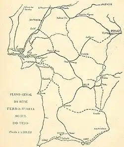 In the 1850s, planning began for a railway on the south bank of the Tagus River, which would be connected by waterway to the city of Lisbon.[1] On July 24, 1854, the government signed a contract with the Marquis of Ficalho and José Maria Eugénio de Almeida, who set up a partnership for the construction of a railway from the south bank to Vendas Novas, starting in Montijo (a locality at the time still known as Aldeia Galega do Ribatejo).[24] Later, the starting point was changed to Barreiro, since this location had a natural harbor for the ships at Vale do Zebro, and as an artificial harbor would have to be built at Montijo, a costly project.[1] On August 26 of that year, an additional contract was signed between the government and the partners for the construction of a second line from the south bank of the Tagus, in Barreiro, to Setúbal.[24]