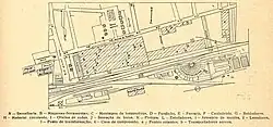 A decree dated 3 June 1936, issued by the General Directorate of Railways, approved the notice for a contract for the construction and assembly of the new buildings necessary for the completion of the general workshops, which had been awarded to Sociedade de Construções Metálicas.[71] The workshop complex included a machine depot, for maintenance of the rolling stock, which was equipped with a traffic circle.[72]