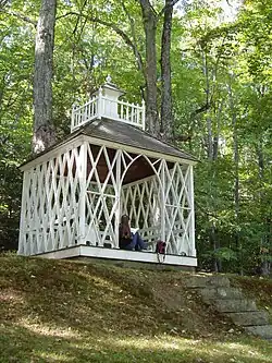 According to tradition, Forest Hall was built as a wedding gift for Charles Barrett and his bride by his father, a prosperous farmer in town who had invested in a glass factory, a toll road, a canal system, and, most successfully, in New Hampshire's first cotton mill.[1] The interiors are elegantly furnished, and numerous reception rooms were designed for entertaining in a cosmopolitan manner. An elaborate allée was later added to the landscape, with a flight of stone steps flanked by maples rising up the hillside behind the house and leading to an elegant summerhouse.