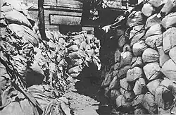 At the “W” Hour, the “Bolt” Battalion of 180 men was stationed on Sniadeckich Street in Southern Downtown (Srodmiescie Poludniowe). In the late evening Brenneisen received an order to move to the south of Jerusalem Avenue to the area of Marszalkowska and Bracka Street. They were tasked with closing German west-east communications. The battalion was aided by the “Wik” Company commanded by Lieutenant Zenon Wiktorczyk and now had a manpower of around 350 people with little gain in firepower. The defense of the communication ditch was based on the barricade built between Krucza St. and Marszalkowska St. Civilians from nearby townhouses actively helped in the barricades construction. The task of breaking ground with pickaxes between houses No. 17 and 22 turned out to be extremely difficult. The tramway tracks had to be blown up using dynamite, which was in little supply already. The underground railroad posed even a bigger problem – its concrete ceiling was impossible to breach with simple pickaxes, that's why sandbags and flagstone were used to fortify most of the barricade. Those fortifications were systematically destroyed by German mortar fire, “Goliaths” and air support. The “Kilinski” Battalion worked on the southern part of the ditch.[2]