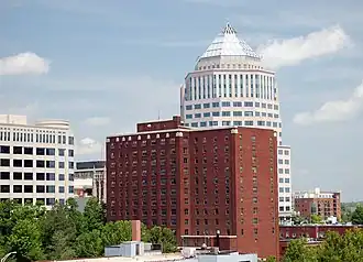Barringer Hotel, also known as Hall House, was a historic hotel building located at Charlotte, Mecklenburg County, North Carolina. The 12-story, red brick building consisted of the main block constructed in 1940 and five-bay-deep rear addition in 1950. The tall first level of the façade featured Art Deco-style decoration including a cast-concrete frontispiece with a low-relief stepped parallel lines and terminated at the top into a zig-zag pattern. The City of Charlotte renovated the structure in 1983 to apartments for elderly, low-income residents.[2]