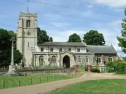 The parish church of All Saints is a Grade I listed building.[6] It has a chancel, an aisled and clerestoried nave with north and south porches and side chapels, and a west tower. The chancel and nave date from the 13th century and perhaps incorporate parts of an older building at its western end. The tower was added later in the 13th century, though only reached its current height in the 16th century, and the chancel was extended in the 14th century. The tower contains six bells.[2]