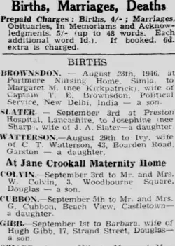 Barry Alan Crompton Gibb was born at Jane Crookall Maternity Home in Douglas, Isle of Man, on 1 September 1946, to Hugh Gibb (15 January 1916 – 6 March 1992), a drummer, and Barbara Gibb (née Pass; 17 November 1920 – 12 August 2016), both Manchester natives.[15] He has English, Irish and Scottish ancestry.[16] Gibb's grandfather Hugh Gibb Sr. was born in Lanarkshire, Scotland in 1892.[17] He has an older sister, Lesley Evans. His second name, "Alan", was after his father's youngest brother who died in infancy. According to Hugh Gibb, in a mix of fact and fiction, his third name, "Crompton", was given to honour the Gibbs' ancestor Sir Isaac Crompton (actually Samuel Crompton).[18]