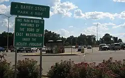 On October 22, 2004 PennDOT dedicated the "J. Barry Stout Park and Ride" off the "Beau Street" exit of I-70 in South Strabane Township.[4][5] Constructed by Greensburg-based Donegal Construction at a cost of $1.2 million, the lighted park and ride lot has 211 spaces and 7 handicapped-accessible spaces.[4] Stout initially suggested the location of the park and ride lot after learning that PennDOT owned the land, which is ideally situated near I-70, I-79, and Route 19.[5]