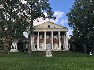 When the Brothers of the Christian Schools' property in Amawalk was condemned to make way for the New Croton Reservoir, they relocated their novitiate to Pocantico. Around 1929, the Rockefeller family purchased the property. With the proceeds from the sale, the brothers of the New York District purchased the Massena estate at the northern section of the hamlet. They moved the novitiate there[3] and established St. Joseph's Normal Institute as a teacher training facility. The Institute closed in 1969. In 1975 the property was bought by the Unification Church, where its Unification Theological Seminary was located.[4] The property was again listed for sale in 2018.[5] It was bought by Bard College in 2023 for $14 million, originally to serve as classroom, dorm, and office space.[6] However, in November 2024, Bard College at Simon's Rock announced that it would be moving to Massena starting in fall 2025.[7] - In 1824, John R. Livingston gave the 250-acre "Edgewater" property to his daughter Margaretta and her husband, Rawlins Lowndes Brown. Brown died in 1852 and the following year, his widow sold the estate to New York financier Robert Donaldson Jr., who commissioned architect Alexander Jackson Davis to add an octagonal library wing. It is now owned by a preservation trust.[8]