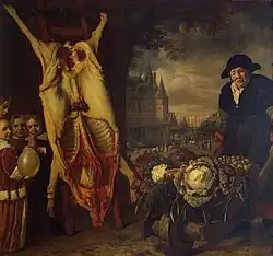 Van der Helst also painted a number of genre scenes. An example of a genre scene by van der Helst is the View of the Nieuwmarkt (1638, Hermitage Museum, Saint Petersburg), which combines still life, cityscape and figure piece. The composition shows an old woman holding a big wheelbarrow full of vegetables. On her left hangs the carcass of large slaughtered pig. Next to the pig are four children, one of whom blows the pig's bladder while the others look at the viewer. In the background is a view on the Nieuwmarkt with the Sint Anthoniswaag. This work was probably made for van der Helst's private use as it likely depicts the view from his house on the Nieuwmarkt.[4]
