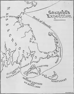 On 14 May 1602, Gosnold made landfall off the southern coast of Maine.[19] with the purpose of setting up a small fishing outpost of 20 of the crew who would stay the winter.[20] They were there hailed by a "Biscay shallop" containing eight men, who the English discovered were not "Christians" as they had supposed but "savages" of "swart" colour who had many European accoutrements and acted boldly among the English.[d]