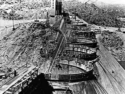 In response to the Great Depression and subsequent drops in crop prices, farmers struggled harder to have a dam constructed on the Verde River.[1] Finally, in 1935, the Salt River Project received approval to build the Bartlett Dam. The U.S. Bureau of Reclamation constructed the dam between 1936 and 1939, in a total of 1,000 days.[2] Upon completion, the dam was the tallest multiple arch buttress type in the world at the time.[3] 80% of the funding for the dam was provided by the Salt River Project (SRP) and 20% by the Bureau of Indian Affairs.[4] Construction on the dam provided needed jobs and flood control on the river. Although flood waters temporarily halted construction in February 1937, flooding was finally minimized with the construction of the dam. The next large flood in the area would not come until the winter of 1965–66.[5]