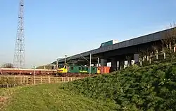 The civil parish has a total area of 297.57 hectares (735.3 acres).[17] The A500 runs east–west through the parish,[3] and the Crewe-to-Stafford railway line runs north west to south east through it; there are currently no stations within Basford (as of 2020). To the north of the A500 is Basford Hall Sorting Sidings.[2][3] Weston Lane runs east–west south of the A500, connecting Shavington and Weston. Back Lane and Casey Lane run south and south west, respectively, from Weston Lane to meet immediately north east of Hough, on the southern boundary of Basford parish. Casey Lane crosses the railway at Casey Bridge.[2][3] The South Cheshire Way and the Crewe and Nantwich Circular Walk long-distance footpaths go through the south-east corner, crossing Basford Brook at a footbridge.[2]