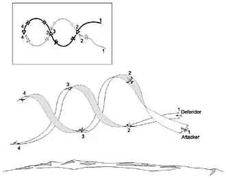Flat scissors, also called horizontal scissors, usually occur after a low-speed overshoot in a horizontal direction. The defender reverses the turn, attempting to force the attacker to fly out in front and to spoil aim. The attacker then reverses, trying to remain behind the defender, and the two aircraft begin a weaving flight pattern.[61]