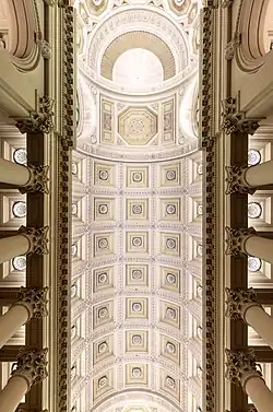 The interior of the basilica consists of three naves, supported by sixteen Corinthian columns which form a large ambulatory around the semicircular apse. The front porch of 8 columns, six at the front and two either side, bears the Latin inscription above: “DIVO. MARINO. PATRONO. ET. LIBERTATIS. AVCTORI. SEN. P. Q.”