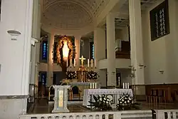 Entering the church, a visitor can see the statue of Our Lady Immaculate in the main altar. This statue is a work of Maurycy Kowalewski and Abel Dziełyński, friars-sculptors from Niepokalanów. In the chapel of St. Joseph (on the right side of the church) there are two important mosaics. The first of them (round mosaic) commemorates the baptism of Poland. The Latin inscription says: Mesco dux baptizatur – Polonia semper fidelis - 966-1966 (Prince Mieszko baptized – Poland is always faithful – 966-1966).[6] The second, huge mosaic (placed on the wall) shows Jesus the Merciful and the Immaculate Heart of Our Lady.