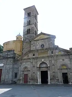 The church was consecrated by Pope Gregory VII in 1077. The façade was commissioned by Pope Leo X, and completed in 1492 to 1494 with designs by Francesco and Benedetto Buglioni. The two portals have polychrome lunettes by the Florentine artists, in the style of Della Robbia. To the left of the façade is the late-baroque external entrance to the Chapel of the Miracle. The tall 13th-century belltower has Romanesque mullioned windows.