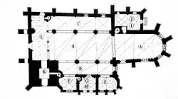 West Chapel has a rectangular wall. The room is vaulted with simple rectangular vault, which ribs end on different kinds of brackets. The chapel is lightened by a window on the south side and geometric tracery.
