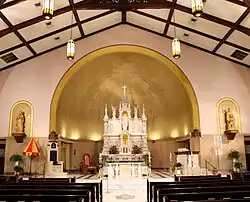 In 1948, the congregation purchased a Wurlitzer electronic organ for $4,500.00 to replace the old pipe organ. The St. Cecilia's Guild started a weekly bingo to raise the money for a new Kilgen pipe organ, which cost $31,832.48.[2] The interior of the church was extensively renovated from 1950 to 1951 and the front portion of the current rectory was completed the following year. The parish completed a new convent in 1958 which eventually became the Cenacle Retreat House. The present pews were installed in the church in 1958 for $11,429.[2] Artist John L. Baker painted the sanctuary ceiling with a vibrant, complex linear painting in 1966.