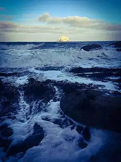 The island is a volcanic plug of phonolitic trachyte rock of Carboniferous (Dinantian) age.[6][7] The rock was first recognised as an igneous intrusion by James Hutton. Hugh Miller visited in 1847 and wrote about the rock's geology in his book Edinburgh and its Neighbourhood, Geological and Historical: with The Geology of the Bass Rock.[4][8] It is one of a small number of islands off the East Lothian coast including the Islands of the Forth. To the west are Craigleith, and the Lamb, Fidra and finally to the west of Fidra, the low-lying island of Eyebroughy. These are also mainly the result of volcanic activity. To the northeast can be seen the Isle of May off the coast of the East Neuk of Fife.