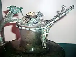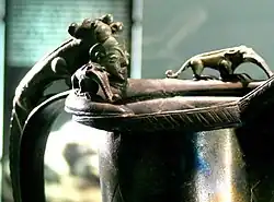 The flagons are richly decorated with glass and coral inlays and a range of animals on the lid. Time has faded the coral but the pieces would have been brightly coloured. The handle is formed as a dog, terminating at the bottom with a human face. The idea of a dog or other animal for a handle comes from Greek and Etruscan culture,[2] as does the motif of two crouching animals lying around the rim, as well as the head at the bottom of the handle. The duck on the spout is a Celtic addition to the scheme. The eyes of the duck and the dogs have been finished by using a complex drill bit[7] and they were drilled by the same person.[8] Both vessels measure just over 40 cm in height. The drinking vessels were found with a pair of Etruscan bronze stamnoi or vessels for wine-mixing that date from the same period (also now in the British Museum).[9]