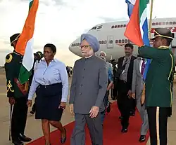 Bathabile receiving Indian Prime Minister Manmohan Singh at Waterkloof Air Force Base on 17 October 2011