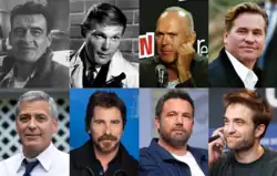 ![]() Batman actors since 1943. Top to bottom, left to right: Lewis Wilson, Adam West, Michael Keaton, Val Kilmer, George Clooney, Christian Bale, Ben Affleck, Robert Pattinson. | |
