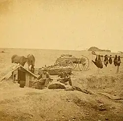 On April 22, the company met a group of buffalo hunters, whose camp had been robbed while they were out hunting by Little Bull's band mentioned earlier.[8]:105 Three of the buffalo hunters joined the company to help track down the Cheyenne camp: Henry Campbell, Charles Shroeder, and Samuel B. Srach.[4]:51 H Company camped the night about five miles from the Sappa, and Henely sent the buffalo hunters along with Homer Wheeler to locate the camp.[8]:101-102 They searched for three days until they found a hunting party of 12 Cheyenne, 2 of which they captured. The four men continued their search until Wheeler finally found a group of horses owned by the Indians. He could tell they were owned by the Indians since they were not alarmed by his presence.[3]:108-110 The scouts returned to the company around 2:00 am on April 23, and Wheeler led the group to the Indian encampment, where around 60 Indians were sheltered along the Middle Fork of Sappa Creek.[4]:52-53 (although Henely reports it to be the North Fork, this is likely because he was unaware of the smaller fork further north on the Sappa).[4]:x