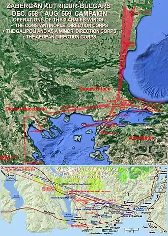 During the winter of 558, a Kutrigur army crossed the frozen Danube and invaded Moesia and Thrace. It then split into three, heading towards Constantinople, Thracian Chersonesus and Thermopylae. Zabergan, leading a group of 7000 cavalry,[5] crossed the Anastasian wall at the beginning of spring 559.[6]
