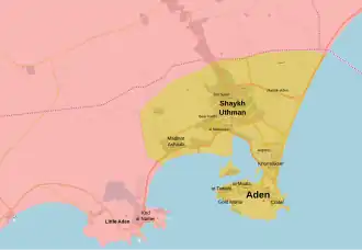 Gun battles erupted in Aden on 28 January 2018 when security forces loyal to the Hadi government attempted to prevent pro-STC demonstrators from entering the city.[38] Districts reportedly affected by the fighting included Khormaksar, al-Mansoura, and Dar Sad, with protests taking place in al-Orouth square. Pro-STC forces were reported to have seized a number of government offices, including the Hadi government's headquarters.[9][34][38]