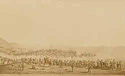 On 19 April 1880, the column was near the village of Ahmed Khel, about 23 miles (37 km) from Ghazni. Here, at a point where the road narrowed, a force of about 12,000 to 15,000 Afghan tribesmen was in place along the hills, threatening the column's flank. As Stewart began to reposition his men to respond, the mass of Afghan tribesmen rushed over the hills and attacked. While the British-led force had difficulty in holding their line, the Afghans were eventually driven back and, after an hour of fierce fighting, the tribesmen fled.[4] The Afghans suffered heavy casualties – 2,000 to 3,000 killed – compared with British and Indian loses of 17 dead and 124 wounded.[2]