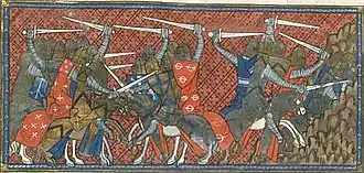 ![]() Miniature of the battle of Andernach between Charles the Bald and Louis, his nephew. Image taken from f. 231v of Chroniques de France ou de St Denis. | |||||||||