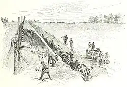 Having determined to continue to Big Bethel without knowledge of the layout or strength of the Confederate positions, Peirce sent Duryee's 5th New York Infantry out first. Captain Kilpatrick along with Captain Charles G. Bartlett and skirmishers were sent forward to scout the Confederate position. They returned to the main body of the Union force and, after observation and talking to a black man and a local woman as well, told the officers in command that the Confederates had between 3,000 and 5,000 men and 30 pieces of artillery.[56] They actually had about 1,400–1,500 men and 5 artillery pieces, but Kilpatrick accurately reported that their position was well fortified.[57][58] If the Union forces had not done enough already to give up their plan and position, Kilpatrick gave notice of the arrival of the Union force at Big Bethel by shooting at Confederate scouts and pickets.[56] As the Union force came up to the field, they could not see the Confederates behind their fortifications but the Confederates also did not have a good view of the Union force because of the shade from the woods behind the field on the right and small buildings on the left. However, they could see the bayonets and flag of a Union force about 0.5 miles (0.80 km) to the left.[56] Major Randolph, commanding the howitzer battalion, fired a shot at this column which ricocheted through the Union line and killed a soldier standing next to Colonel Bendix.[59]