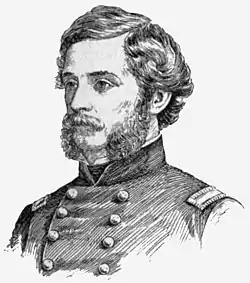 Meanwhile, Kilpatrick was trying to lead part of the 5th New York around the Confederates from the right but they came under heavy fire.[67] As men were falling, Lieutenant Colonel (later major general) Gouverneur K. Warren came forward on a white mule and began to lead the men toward a ford through the creek 0.75 miles (1.21 km) from the main road to Hampton. A platoon guarding the ford was outnumbered by the Union force and retreated as they approached. Magruder ordered Captain W. H. Werth forward with a howitzer company. Werth hurried to the ford and arrived before the Zouaves of the 5th New York Infantry under Duryee and Kilpatrick. Werth drove them off from the ford with a howitzer shot but they continued to fight from the wood line. Grape shot tore the rectangle off Colonel Duryee's left shoulder, wounded Captain Kilpatrick in the thigh, and killed a soldier behind them.[68][69] The 5th New York Infantry was exhausted from being the first unit on the march and from heavy action in the day's fighting so the unit was pulled back.[70] Kilpatrick, who was badly wounded by the shot through his thigh, had to be rescued and carried away by Captain Winslow at the very end of the battle after his regiment had withdrawn. Otherwise, he would have fallen into Confederate hands.[71]